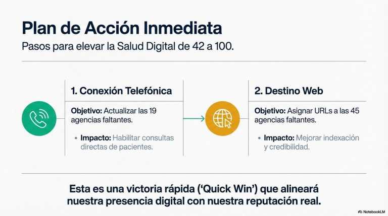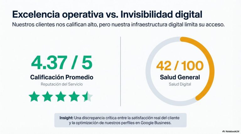 El puntaje técnico de 42/100 es una penalización por omisión de datos (presencia web y teléfono) que «mata de hambre» la autoridad local de la marca.