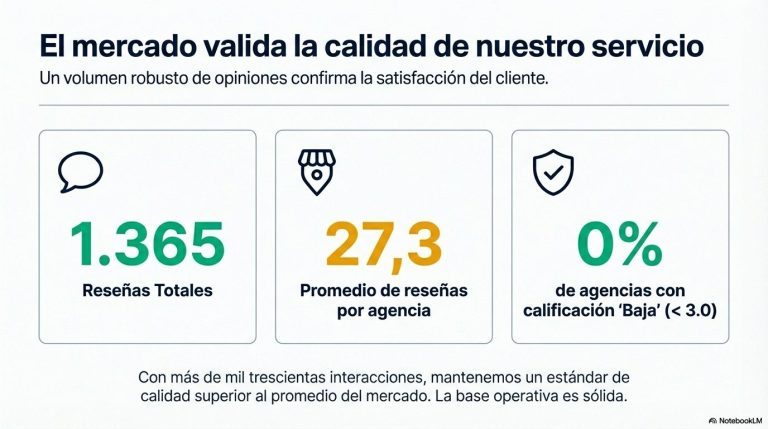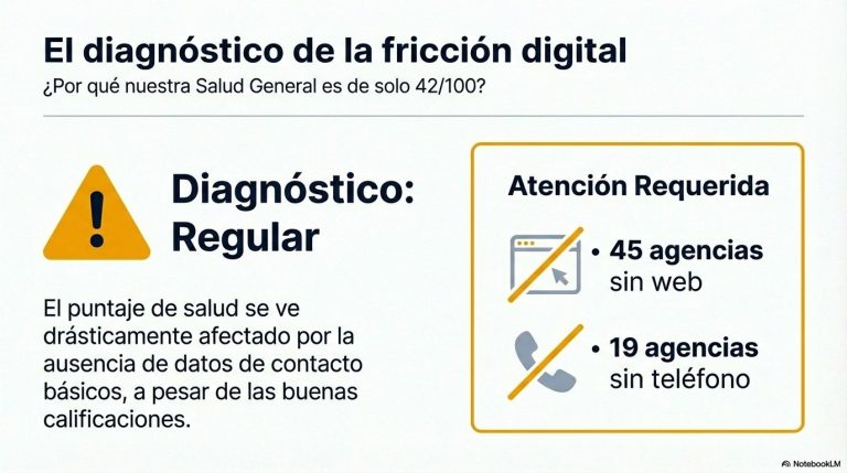 Es fascinante observar cómo el «cariño» del público no logra compensar las deficiencias técnicas. La red acumula 1,365 reseñas, con un 78% de las agencias calificadas como «Excelente» o «Bueno». Sin embargo, este volumen de datos positivos es «desperdiciado» por la plataforma, ya que el puntaje de salud de 42/100 actúa como un lastre que impide que estas reseñas impulsen el posicionamiento orgánico.