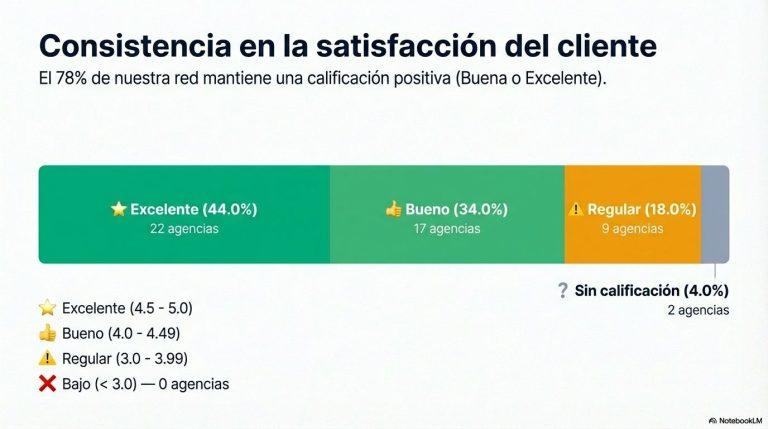 • Excelente (4.5 – 5.0): 22 agencias (44.0%)