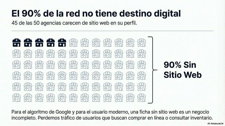 El dato más crítico de esta auditoría es que 45 de las 50 agencias (90%) carecen de un sitio web vinculado a su perfil de Google Business. En 2026, esto representa una ruptura del embudo local definitiva. No se trata solo de un enlace faltante; es una pérdida total de Autoridad Local.