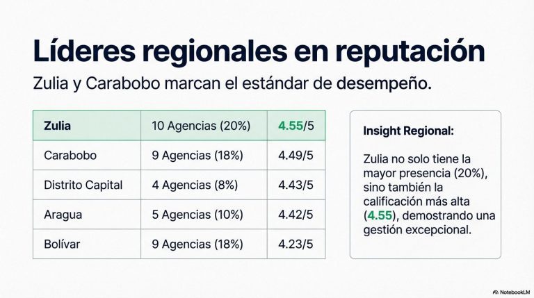Dentro de este panorama, el estado Zulia se erige no solo como líder, sino como el Grupo de Control de esta investigación. Con 10 agencias (20% de la red), ostenta la calificación más alta: 4.55/5.